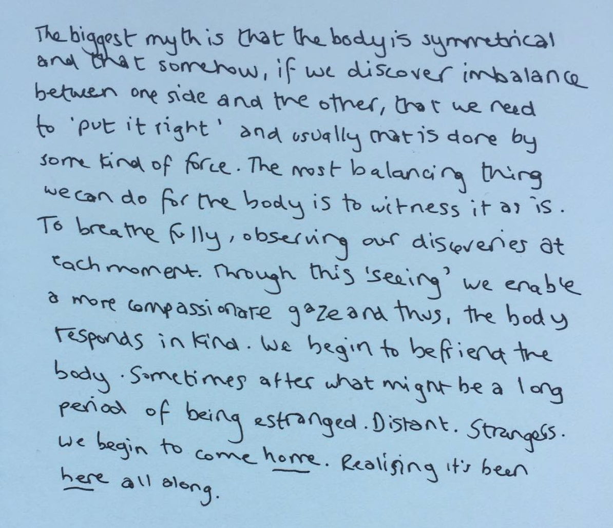 “The biggest myth is that the body is symmetrical and that somehow, if we discover imbalance between one side and the other, that we need to ‘put it right’ and usually that is done by some kind of force. The most balancing thing we can do for the body is to witness it as is. To breathe fully, observing our discoveries at each moment. Through this ‘seeing’ we enable a more compassionate gaze and thus, the body responds in kind. We begin to befriend the body. Sometimes after what might be a long period of being estranged. Distant. Strangers. We begin to come home. Realising it’s been here all along.”